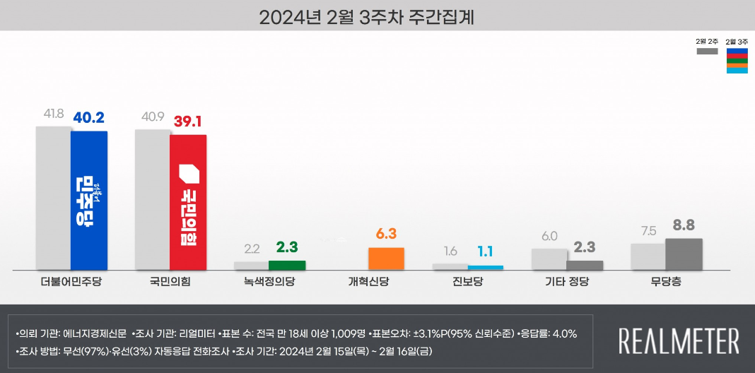 여론조사 전문기관 리얼미터(대표 이택수)가 에너지경제신문 의뢰로 2월 15일(목)부터 2월 16일(금)까지 이틀 동안 전국 18세 이상 유권자 25,160명에게 통화를 시도해 최종 1,009명(무선 97 : 유선 3)이 응답을 완료한 2024년 2월 3주 차 정당 지지도 집계 결과, 더불어민주당이 지난 2월 2주차 주간 집계 대비 1.6%P 낮아진 40.2%, 국민의힘은 1.8%P 낮아진 39.1%, 개혁신당은 6.3%, 녹색정의당은 0.1%P 높아진 2.3%, 진보당은 0.5%P 낮아진 1.1%를 기록하였다. 무당층은 1.3%P 증가한 8.8%로 조사됐다.