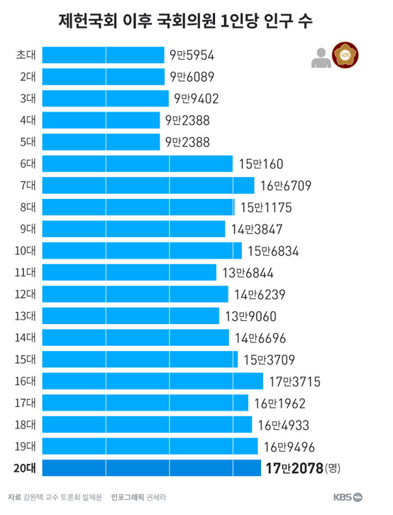 현재 국회의원 1인당 인구 수는 1988년 민주화 이후 첫 선거 때보다도 3만 명 이상 많을 뿐만 아니라 유신 때나 신군부인 5공화국 때보다도 많다고 밝혔습니다.