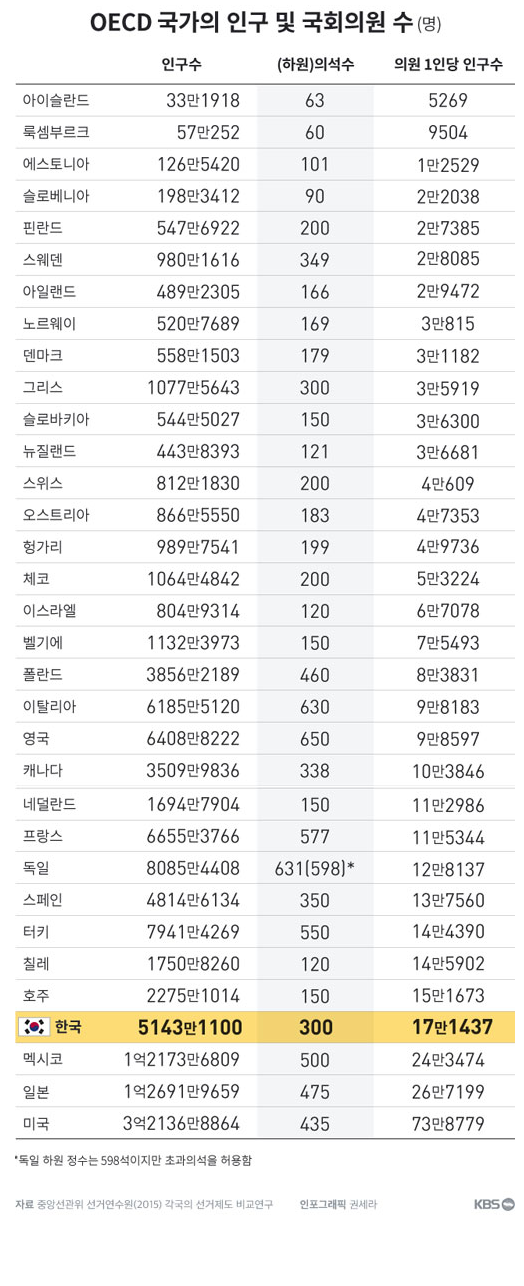 인구 대비 국회의원 수로 본다면, 현재 우리나라 국회의원 수는 많지 않다는 게 정치학자들의 대체적인 평가입니다.