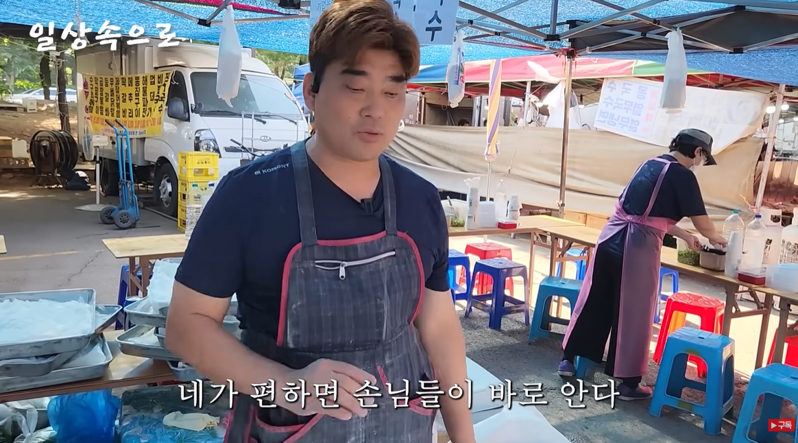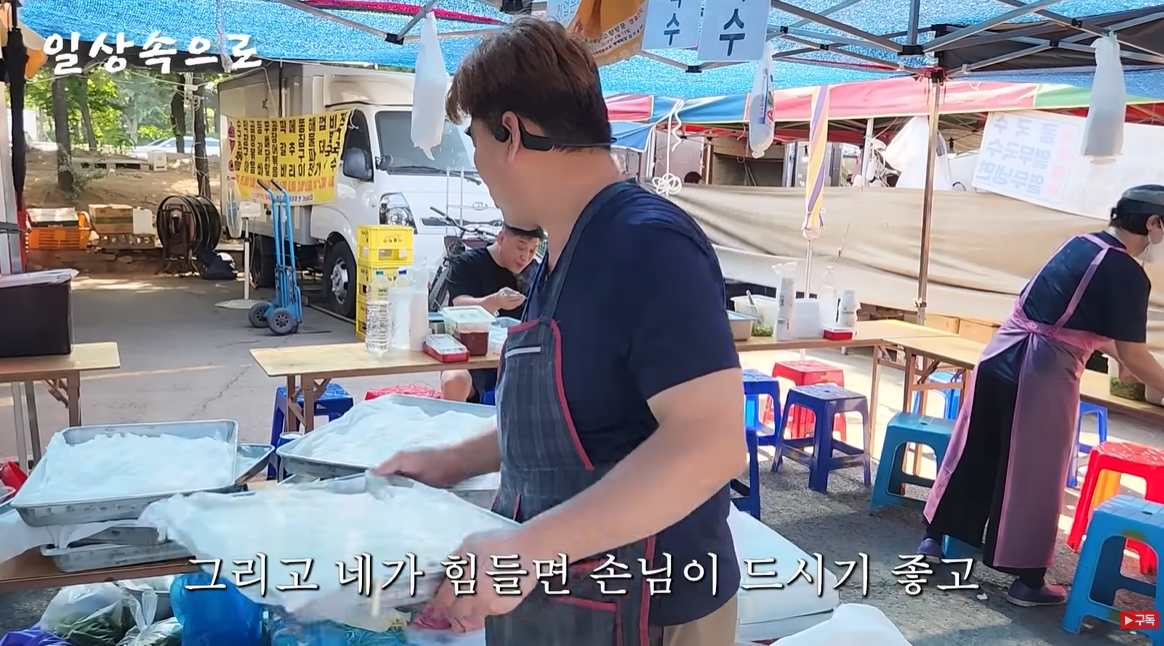 어머니의 가업을 이어서 칼국수를 만든다. (성남에서 어머니와 그 아들 유영진씨가 50년 째, 영진씨는 32년째)