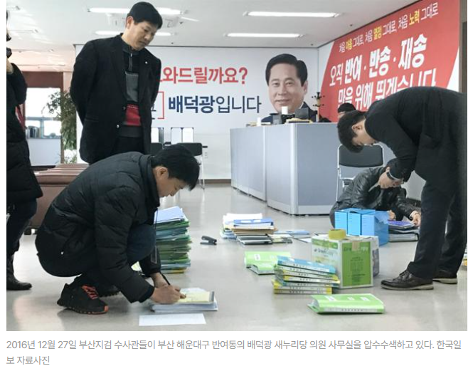 2016년 12월 27일 부산지검 수사관들이 부산 해운대구 반여동의 배덕광 새누리당 의원 사무실을 압수수색하고 있다. 한국일보 자료사진