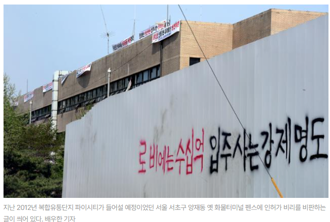지난 2012년 복합유통단지 파이시티가 들어설 예정이었던 서울 서초구 양재동 옛 화물터미널 펜스에 인허가 비리를 비판하는 글이 씌어 있다. 배우한 기자