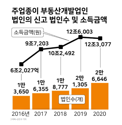 지난해 법인세를 신고한 부동산개발업 법인은 2만6,646개였다. 이 법인들의 전체 수입금액은 69조357억 원이다. 여기서 각종 경비를 제외한 소득금액은 12조3,077억 원이고, 총 부담세액은 1조6,294억 원이다. 2016년과 비교하면 법인세 신고 법인수는 2배 늘었고, 수입금액과 소득금액은 각각 1.6배, 2.0배 증가했다.