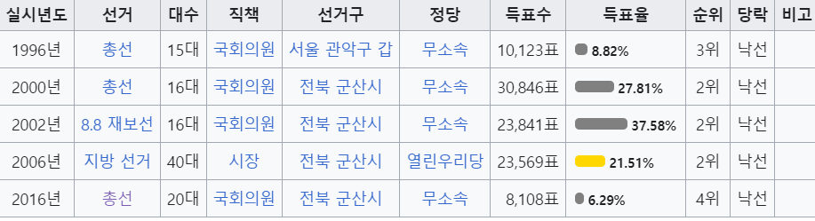 그 이후 무소속과 열린우리당 후보로 1996년부터 2016년까지 20년 동안 시장, 국회의원 선거에 출마했으나 낙선했다.