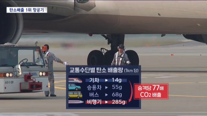 비행기 탄소 배출량은 기차,버스에 비해 승객 1인당 77배 이산화탄소 배출.