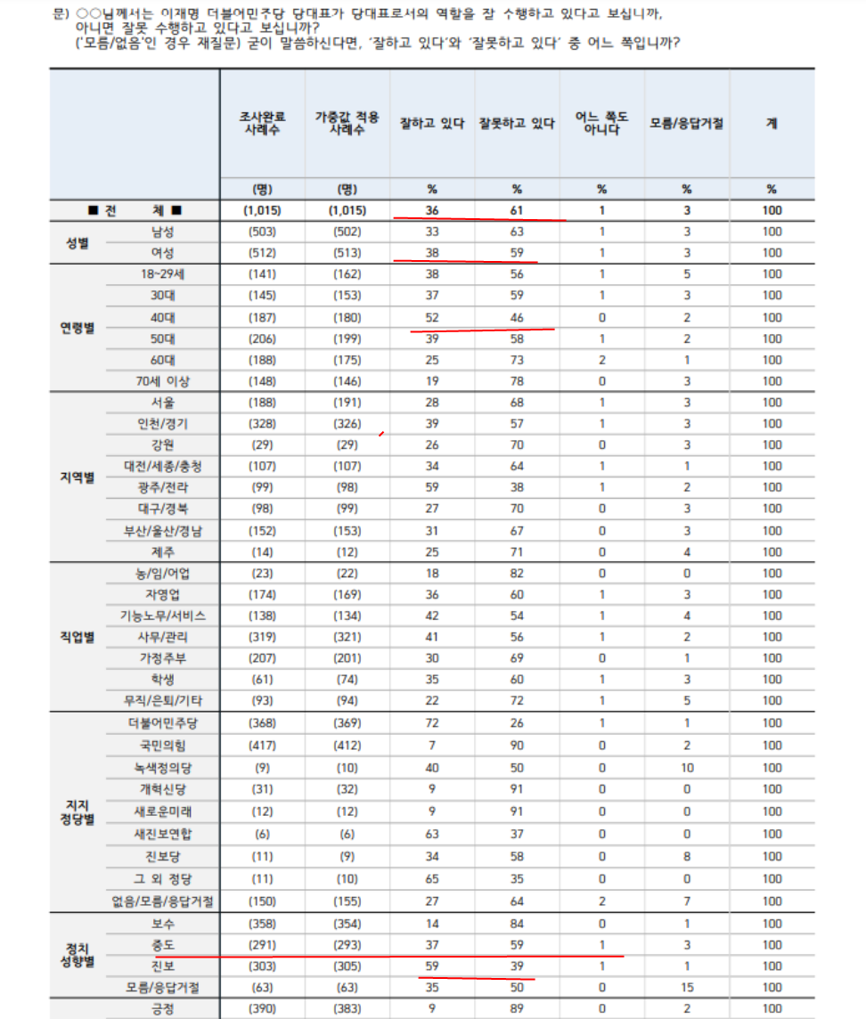 이재명 민주당 당대표 잘하고 있다 36, 잘못하고 있다 61.