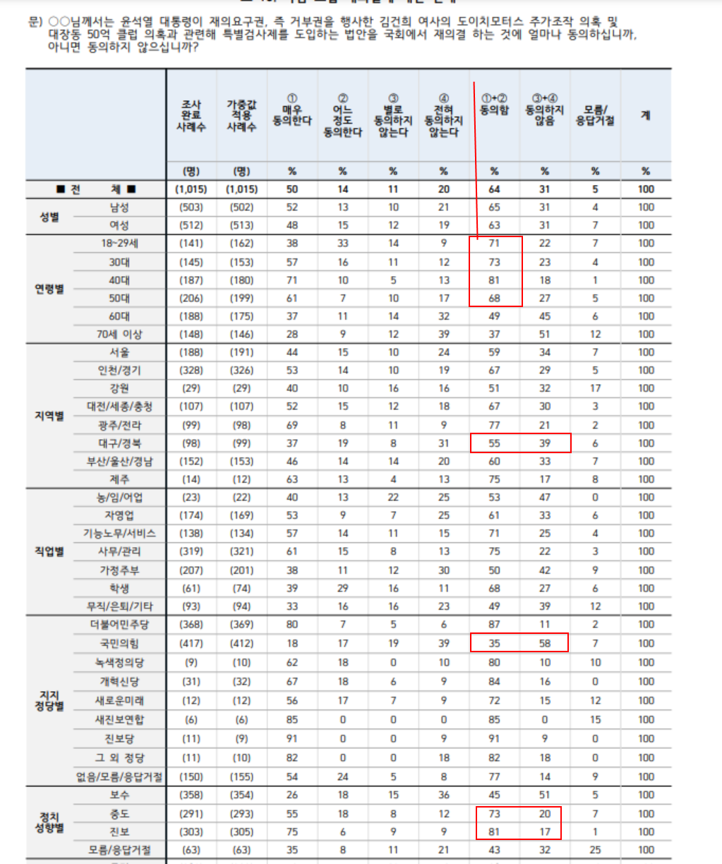 한국정치/여론조사 public poll 도이치모터스 주가조작 김건희 특검 재도입 찬성 64%, 반대 31%. 대구경북 찬성 55%, 반대 39% by 원시 2024. 2. 27. 도이치모터스 주가조작 김건희 특검 재도입 찬성 비율이 압도적으로 반대보다 높다. 전체 찬성 64%, 반대 31%. 심지어 대구경북 찬성 55%, 반대 39% 한국 갤럽. 2024년 2월 23일표본 오차 +- 3.1 % 무선전화 한국 갤럽. 2024년 2월 23일 표본 오차 +- 3.1 % 무선전화 공유하기 게시글 관리 한국정치 노트 Notes on the Politics of Korea 저작자표시 비영리 변경금지 (새창열림) '한국정치 > 여론조사 public poll' 카테고리의 다른 글 서울 메가시티 찬성 34%, 반대 53% . 김포, 과천, 고양, 부천, 성남, 안양시 등을 서울시에 편입해 '메가시티'로 만드는 것. 진보층 반대 75%, 보수층은 반대 38% (1) 2024.02.27 [한국갤럽] 의대 정원을 기존 3천명에서 5천명으로 2천명 확대하기로 했다. 찬성 76%, 반대 19% (0) 2024.02.27 한국갤럽. 2월 23일. 총선 지역구, 비례투표 (정당투표) 민주 34, 국힘 39, 녹색정의당 3, 개혁신당 6 (0) 2024.02.27 총선 민주당 걸림돌이 이재명. 이재명 민주당 당대표 잘하고 있다 36, 잘못하고 있다 61. (2월 23일.한국 갤럽 여론조사) (0) 2024.02.27 부산 동래구 총선 여론조사 -정당 지지도. 국힘 53, 민주 27.8, 녹색정의당 1.4, 개혁신당 4.9, 없음 8.8 (0) 2024.02.22 리얼미터. 2월 3주차. 민주 40.2%, 국힘 39.1%, 개혁신당 6.3%, 녹색정의당 2.3% 무당층 8.8% (0) 2024.02.20 mbc 3차 패널 총선 여론조사 (Feb 3). 비례대표 (정당투표) . 국힘 28%, 민주당 38%, 개혁신당 9%, 정의당 5% (2) 2024.02.15 관련글 [한국갤럽] 의대 정원을 기존 3천명에서 5천명으로 2천명 확대하기로 했다. 찬성 76%, 반대 19% 한국갤럽. 2월 23일. 총선 지역구, 비례투표 (정당투표) 민주 34, 국힘 39, 녹색정의당 3, 개혁신당 6 총선 민주당 걸림돌이 이재명. 이재명 민주당 당대표 잘하고 있다 36, 잘못하고 있다 61. (2월 23일.한국 갤럽 여론조사) 부산 동래구 총선 여론조사 -정당 지지도. 국힘 53, 민주 27.8, 녹색정의당 1.4, 개혁신당 4.9, 없음 8.8