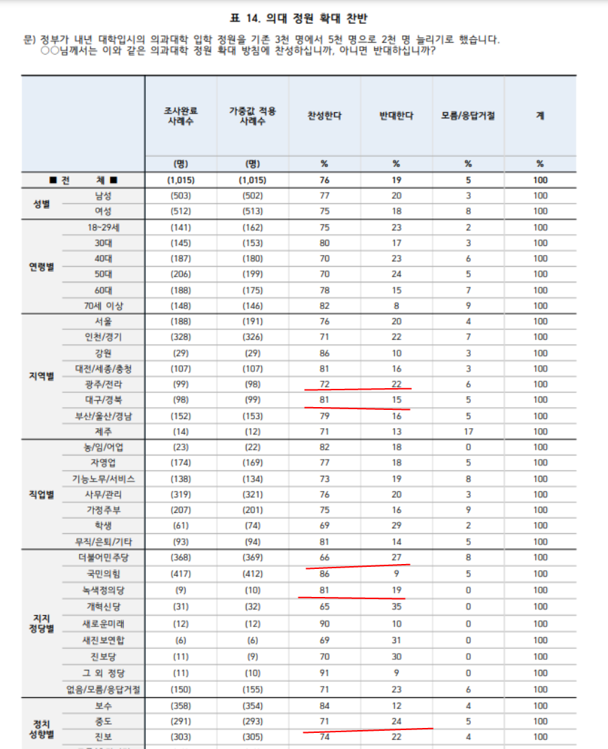 한국정치/여론조사 public poll [한국갤럽] 의대 정원을 기존 3천명에서 5천명으로 2천명 확대하기로 했다. 찬성 76%, 반대 19% by 원시 2024. 2. 27. 의대 정원, 의대 정원을 기존 3천명에서 5천명으로 2천명 확대하기로 했다. 찬성 76%, 반대 19% 공유하기 게시글 관리 한국정치 노트 Notes on the Politics of Korea 저작자표시 비영리 변경금지 (새창열림) '한국정치 > 여론조사 public poll' 카테고리의 다른 글 3월4일 여론조사 (엠브레인) 정당 투표 (비례 투표) 국힘위성 30, 민주위성 21, 녹색정의 2, 개혁신당 4, 새로운미래 2, 조국신당 15, 기타 4, 미정 19, 모름 5. (0) 2024.03.07 조국 신당 창당, 반대 63%, 찬성 29%. 전 연령대 전 지역별 조국신당 창당 반대가 더 많다. (0) 2024.02.29 서울 메가시티 찬성 34%, 반대 53% . 김포, 과천, 고양, 부천, 성남, 안양시 등을 서울시에 편입해 '메가시티'로 만드는 것. 진보층 반대 75%, 보수층은 반대 38% (1) 2024.02.27 한국갤럽. 2월 23일. 총선 지역구, 비례투표 (정당투표) 민주 34, 국힘 39, 녹색정의당 3, 개혁신당 6 (0) 2024.02.27 도이치모터스 주가조작 김건희 특검 재도입 찬성 64%, 반대 31%. 대구경북 찬성 55%, 반대 39% (0) 2024.02.27 총선 민주당 걸림돌이 이재명. 이재명 민주당 당대표 잘하고 있다 36, 잘못하고 있다 61. (2월 23일.한국 갤럽 여론조사) (0) 2024.02.27 부산 동래구 총선 여론조사 -정당 지지도. 국힘 53, 민주 27.8, 녹색정의당 1.4, 개혁신당 4.9, 없음 8.8 (0) 2024.02.22 관련글 조국 신당 창당, 반대 63%, 찬성 29%. 전 연령대 전 지역별 조국신당 창당 반대가 더 많다. 서울 메가시티 찬성 34%, 반대 53% . 김포, 과천, 고양, 부천, 성남, 안양시 등을 서울시에 편입해 '메가시티'로 만드는 것. 진보층 반대 75%, 보수층은 반대 38% 한국갤럽. 2월 23일. 총선 지역구, 비례투표 (정당투표) 민주 34, 국힘 39, 녹색정의당 3, 개혁신당 6 도이치모터스 주가조작 김건희 특검 재도입 찬성 64%, 반대 31%. 대구경북 찬성 55%, 반대 39%