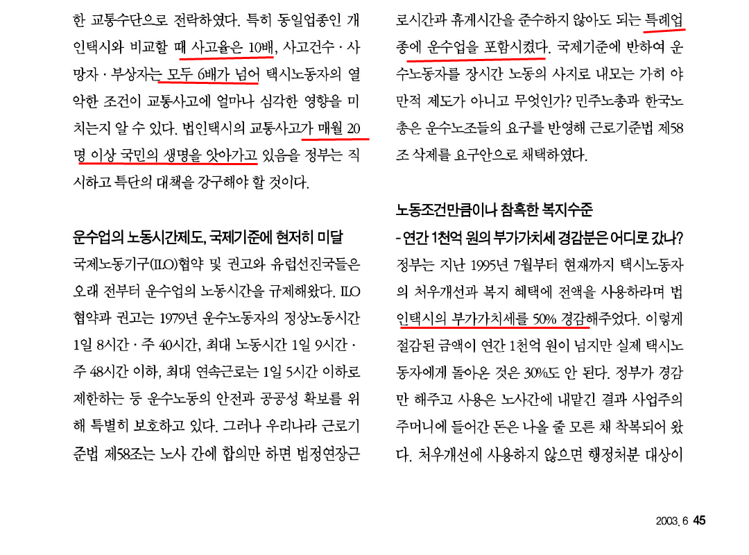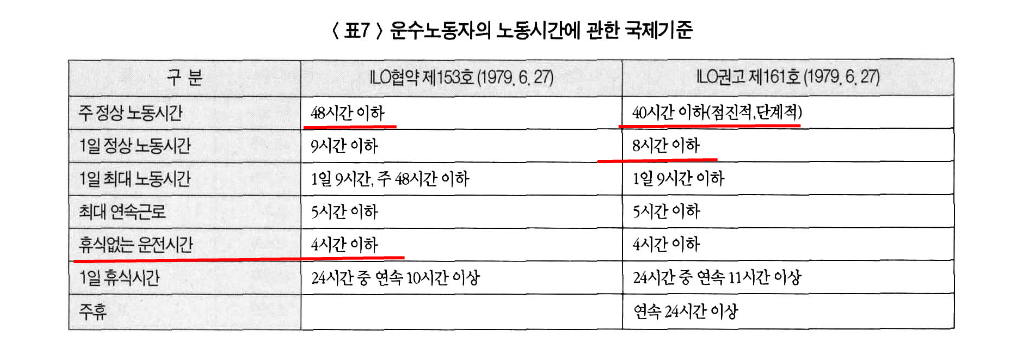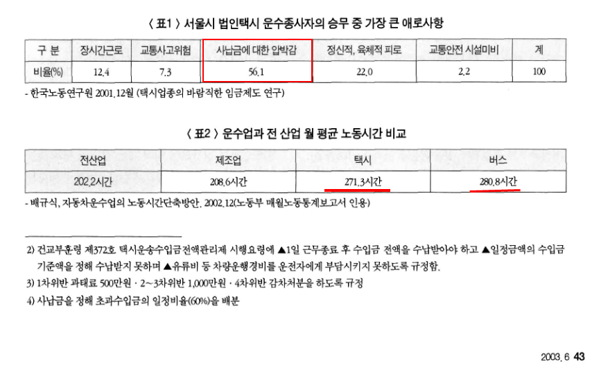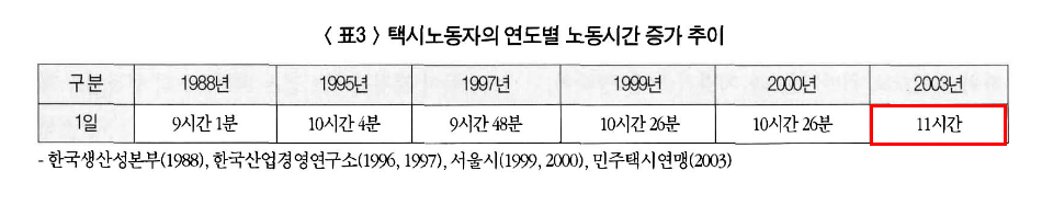 다른 산업 노동자들의 평균노동시간과 비교해, 택시 노동자들이 월 평균 70시간 더 일하고 있음.