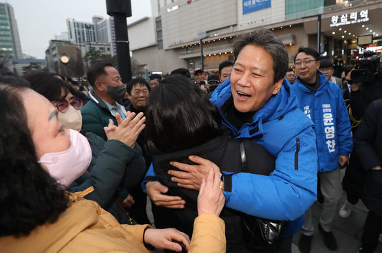 임종석 전 대통령비서실장이 28일 오후 서울 성동구 왕십리역 광장에서 시민들과 포옹을 나누고 있다. 2024.2.28 뉴스1