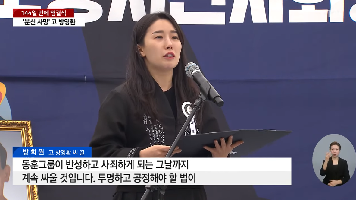 [방희원 / 고 방영환 씨 딸 : 동훈그룹이 반성하고 사죄하게 되는 그날까지 계속 싸울 것입니다. 투명하고 공정해야 할 법이 자본 앞에서 무너지지 않았으면 좋겠습니다. 저 자랑스럽게 아빠를 웃으면서 보고 싶습니다.]