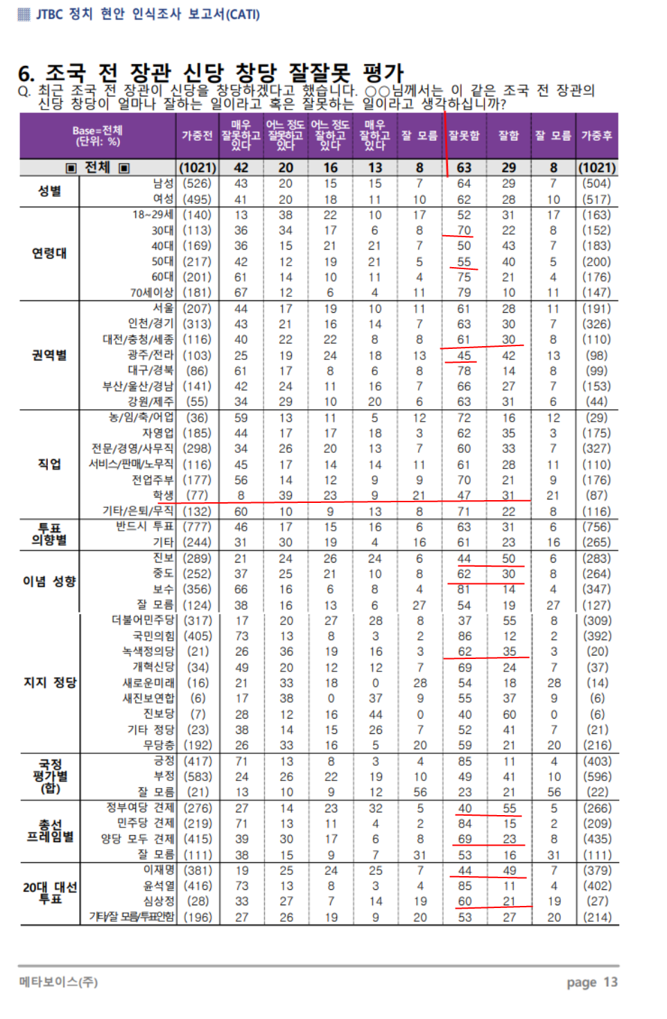 조국 신당 창당, 반대 63%, 찬성 29%. 전 연령대 전 지역별 조국신당 창당 반대가 더 많다. 연령대로 특기 사항은 조국 자녀 특혜 유죄 판결인데도, 10~20대가 찬성 52%, 반대 31%로, 연령층 중에서 반대가 가장 낮게 나왔다. 50대가 반대 55%, 찬성 40%이다.