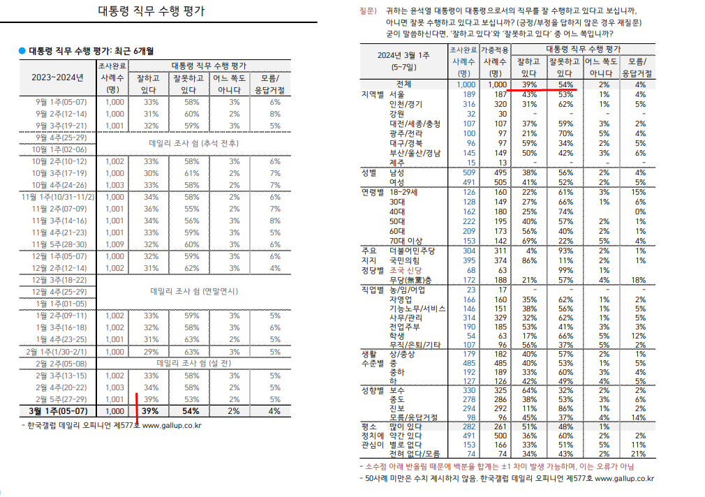 윤석열 잘함 39, 못함 54