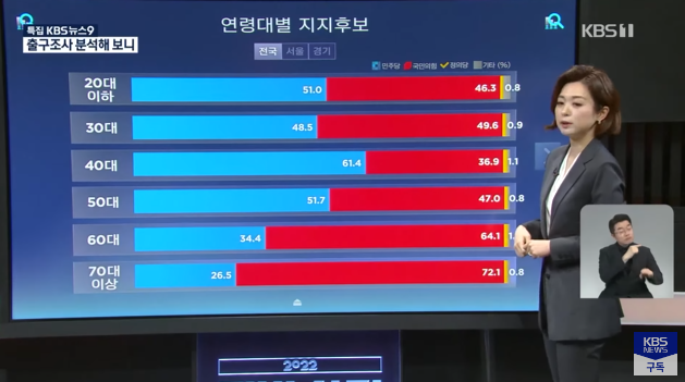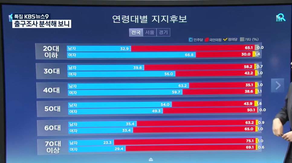 20대 이하 남성 65.1%는 국민의힘, 20대 이하 여성 66.8% 민주당에 투표.