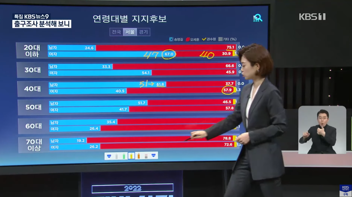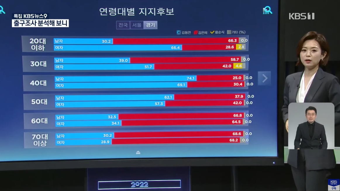 경기지사 선거 역시 20대 이하 남성의 66.3%는 김은혜 국민의힘 후보를, 20대 이하 여성 66.4%는 김동연 민주당 후보를 찍었다