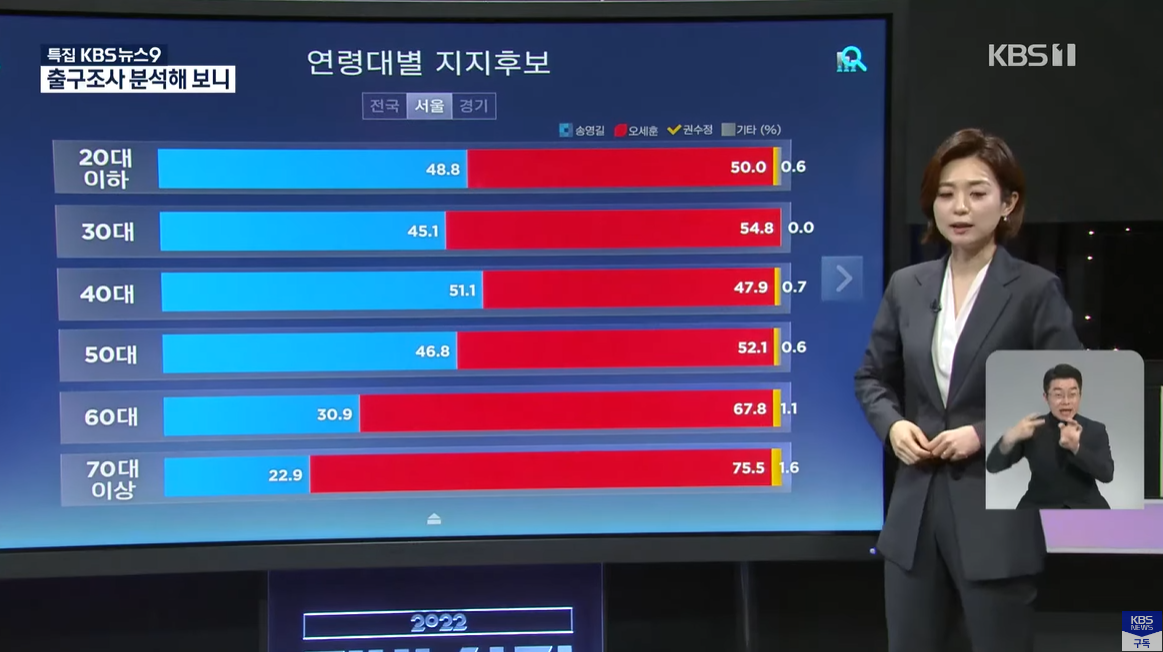 40대 71%, 50대 59.7% 김동연 후보 뽑았다고 응답했습니다.
