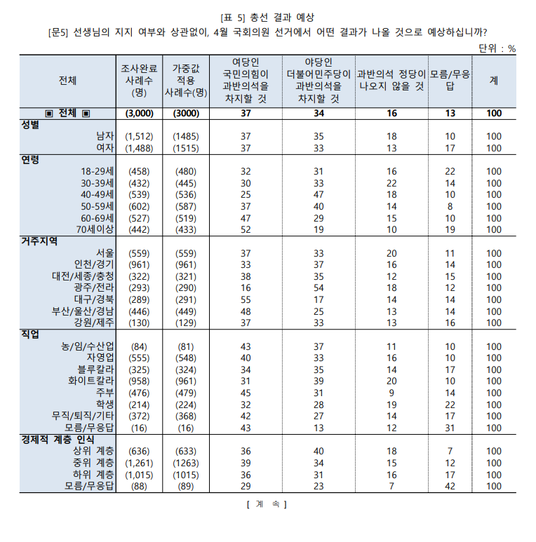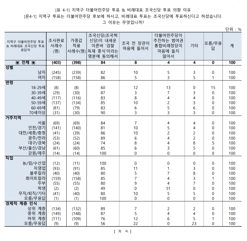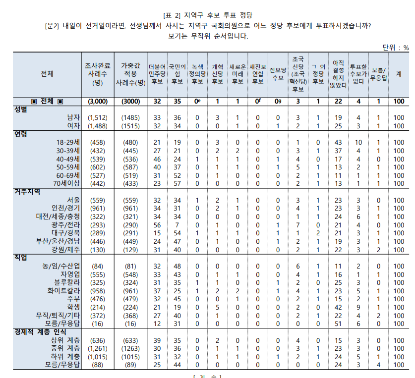 1. 비례대표 투표.민주위성 16,조국신당 17, 국힘위성 32, 녹색정의 1, 개혁신당 3, 새미래 1, 미결정 24, 정당없음 4
