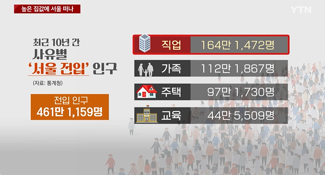 10년간 서울로 전입한 인구 (461만 1159명). 직업 164만, 가족 112만, 주택 97만, 교육 45만