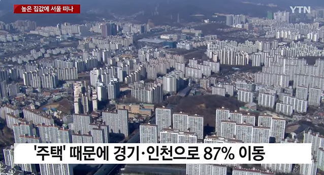 특히 주택을 이유로 서울을 빠져나간 인구 가운데 87%가 경기와 인천으로 이동했습니다.