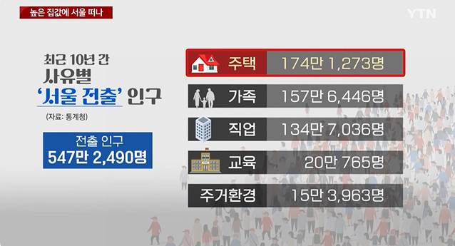 서울은 아직도 21세기 난쏘공. 지난 10년간 서울 떠난 이유 주택문제 174만, 서울 전입 직업 164만, 주택 97만, 교육 45만