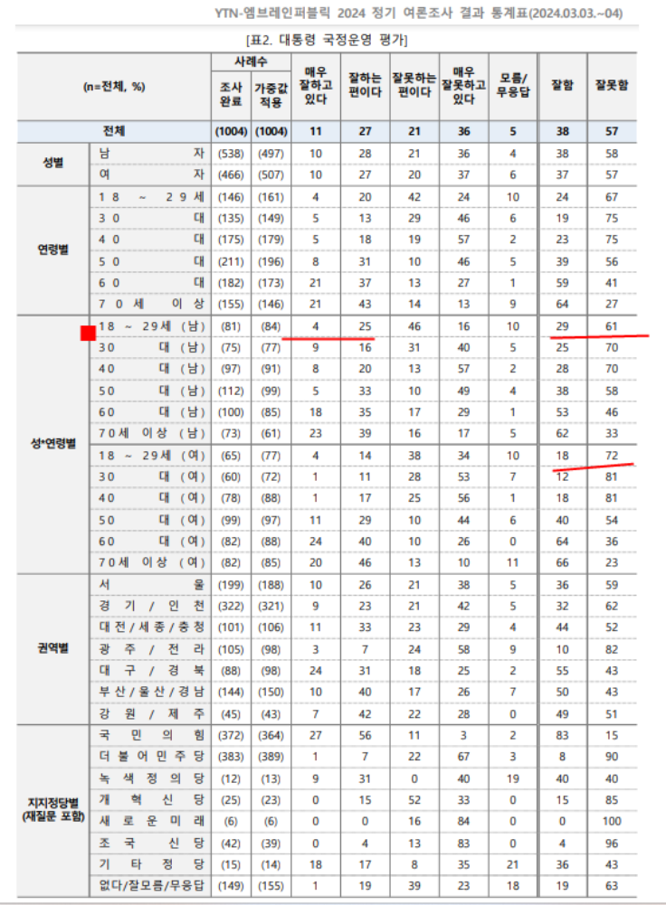 한국정치/여론조사 public poll 20대 남자 윤석열 잘함 29%, 못함 61%로 윤석열 정부에 대한 비판적임. by 원시 2024. 3. 18. 연령별, 성별 비례대표 분석 윤석열 국정평가. 1. 18세~ 20대 전체. 잘함 24%, 못함 67% 20대 남자 윤석열 잘함 29%, 못함 61%로 20대 남자들은 윤석열 정부에 비판적임. 20대 여자의 경우, 윤석열 잘함 18%, 못함 72%임. 2. 30대 전체 윤석열 잘함 19%, 못함 75% 30대 남자. 윤석열 잘함 12%, 못함 70% 30대 여자. 윤석열 잘함 12%, 못함 81% 공유하기 게시글 관리 한국정치 노트 Notes on the Politics of Korea 저작자표시 비영리 변경금지 (새창열림) '한국정치 > 여론조사 public poll' 카테고리의 다른 글 410 총선 . 서울 종로구 . 민주당 곽상언 49.4%, 국민의힘 최재형 39%, 개혁신당 금태섭 6.1% (0) 2024.03.19 410 총선. 서울 영등포갑. 민주당 채현일 51.8%, 국민의힘 김영주 36.6%, 개혁신당 허은아 7% (0) 2024.03.19 410 총선. 서울 동작을 여론조사민주당 류삼영 45.9 %, 국민의힘 나경원 46.3% (0) 2024.03.19 3월 14일. 한국갤럽. 비례대표 투표. 개혁신당 5%, 국힘위성정당 37%, 녹색정의당 2%, 민주위성정당 25%, 새로운미래 2%, 조국혁신당 15% 부동층 13% (0) 2024.03.17 410 총선 여론조사. (한국리서치) 비례투표 미결정층 24% .중도층 윤석열 지지 35, 야당지지 55 (0) 2024.03.13 2022.6.1 지방선거 투표 성향. 2030 투표 남녀 차이 (1) 2024.03.13 2024 총선. 부산 해운대구 여론조사 특징 (중도 윤석열 정부 견제, 보수 결집) 연령대별 분리 현상. 부산 30대 이하 동률, 40~50대 윤석열 견제, 60대 이상 윤석열 지지. (2) 2024.03.13 관련글 410 총선. 서울 영등포갑. 민주당 채현일 51.8%, 국민의힘 김영주 36.6%, 개혁신당 허은아 7% 410 총선. 서울 동작을 여론조사민주당 류삼영 45.9 %, 국민의힘 나경원 46.3% 3월 14일. 한국갤럽. 비례대표 투표. 개혁신당 5%, 국힘위성정당 37%, 녹색정의당 2%, 민주위성정당 25%, 새로운미래 2%, 조국혁신당 15% 부동층 13% 410 총선 여론조사. (한국리서치) 비례투표 미결정층 24% .중도층 윤석열 지지 35, 야당지지 55