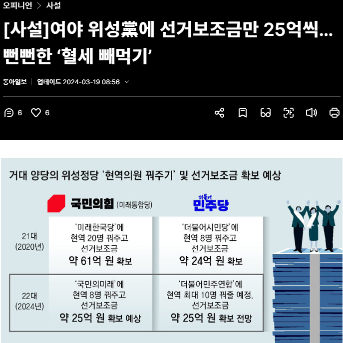 보수 일간지로 알려진 동아일보 사설이 민주당과 국민의힘 '위성정당'이 세금 도둑질을 하며 '선거 재테크'를 하고 있다고 비판했다. 동아일보가 평소에 독일식이나 뉴질랜드가 택하고 있는 '연동형' 비례대표제를 잘 설명했으면 더 좋았을 것이다. 동아일보가 민주당과 국민의힘 '위성정당'의 혈세 빼먹기를 비판한 점은 최소한의 언론의 역할은 했다고 본다.
