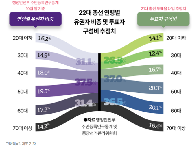 내년 4월 치러질 22대 국회의원 선거는 '그레이(Gray) 총선'이 될 참이다. 연령별 유권자 수에서 사상 최초로 60대 이상(6070세대)이 30대 이하(2030세대)를 넘어섰기 때문이다. 다만 고령 인구의 증가