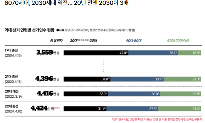 [단독] 2024 '그레이 총선'... 6070 유권자 수 2030 처음 앞섰다 | 한국일보