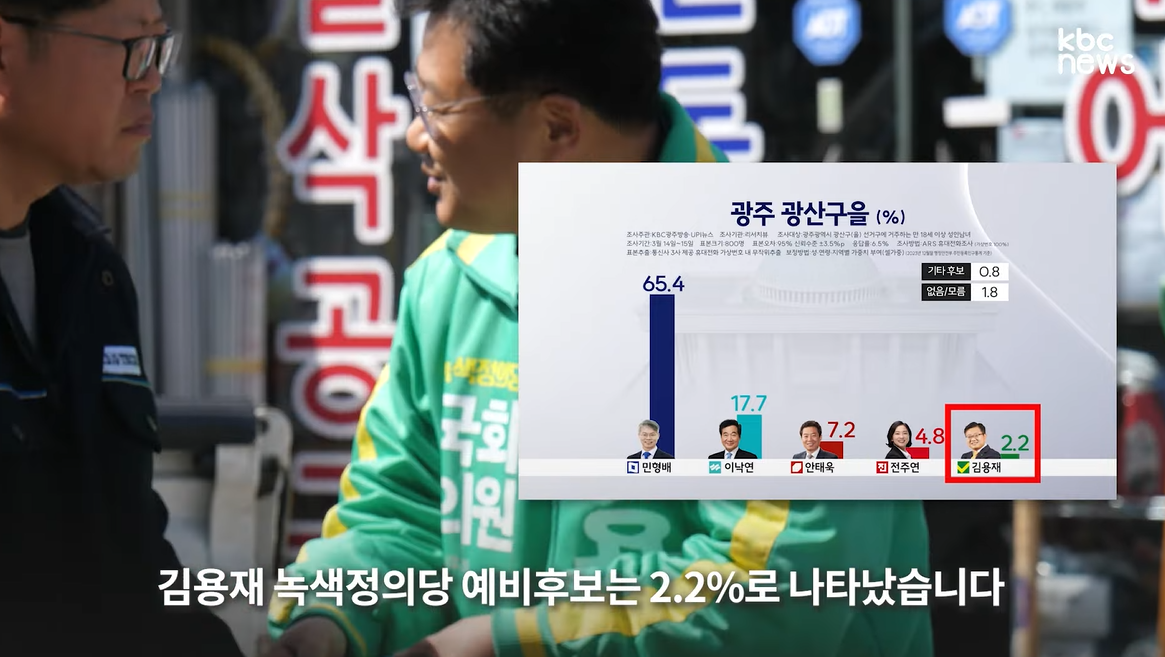 410총선 여론조사. 광주 광산을. 민주당 민형배 65.4. 이낙연 17.7, 국민의힘 안태욱 7.2, 녹색정의당 김용재 2.2, 진보당 전주연 4.8