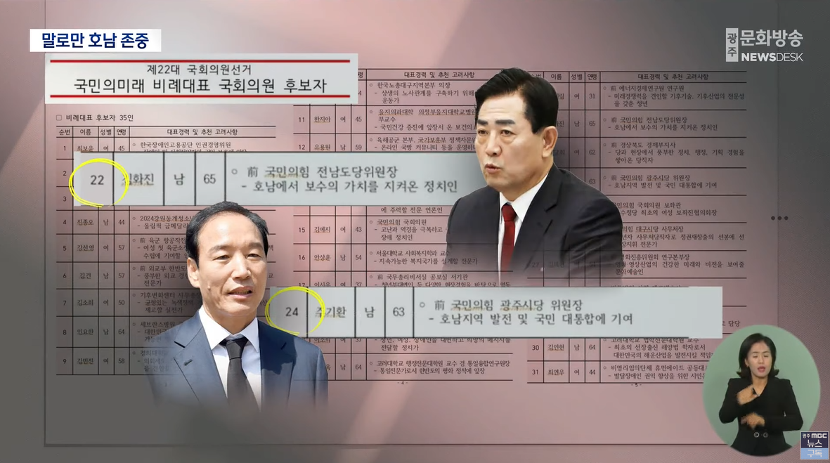 국민의힘 위성정당 비례대표. 광주 호남 홀대론 대두.