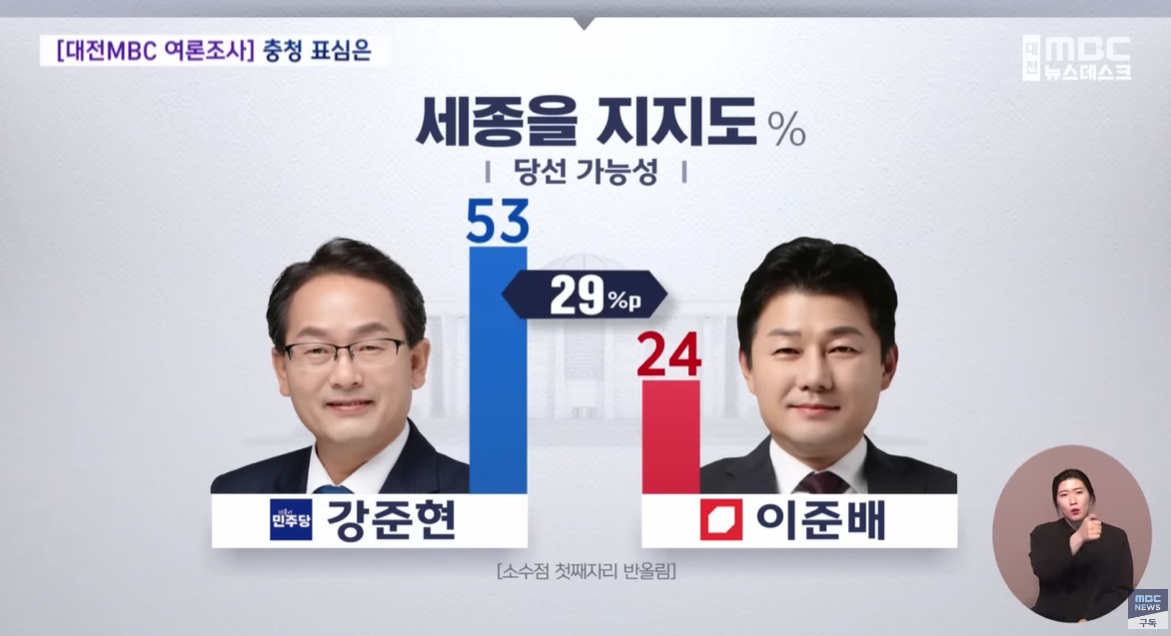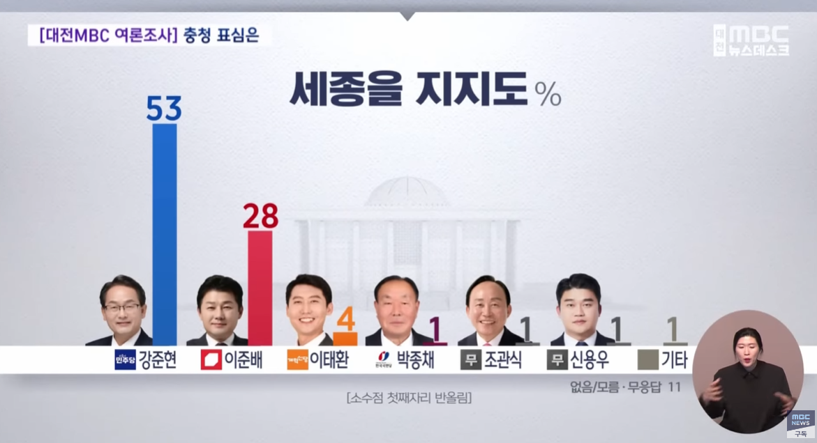 2024 총선. 여론조사. 세종을. 강준현(민주) 53, 이준배(국힘) 28, 이태환(개혁신당) 4.