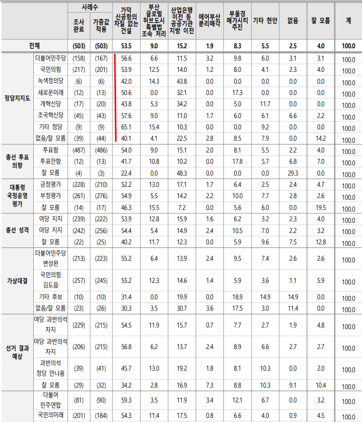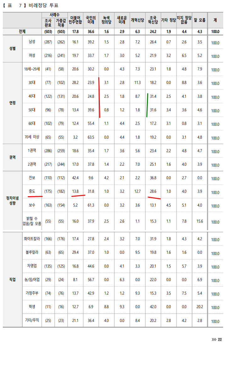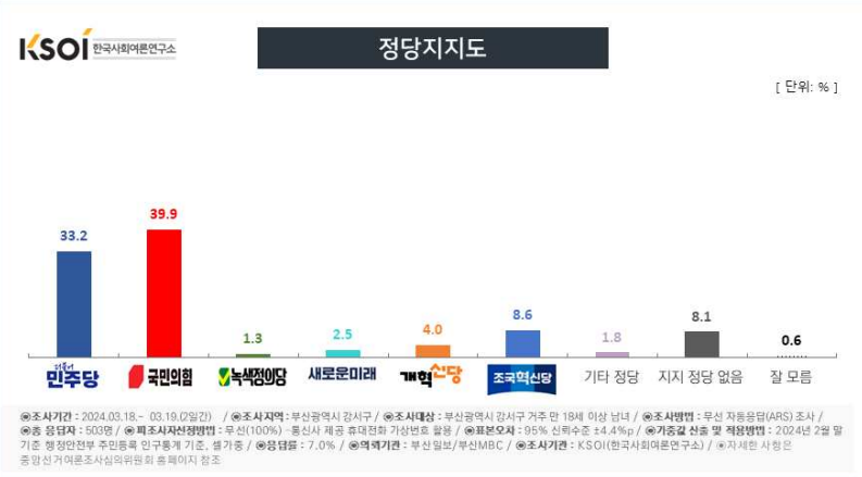 민주 33.2. 국힘 39.9, 녹색정의당 1.3, 새로운미래 2.5, 개혁신당 4, 조국혁신당 8.6, 없음 8.1
