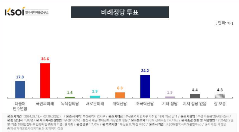 민주위성 17.8, 조국혁신 24.2, 국힘위성 36.6, 녹색정의 1.6, 새로운미래 2.9, 개혁신당 6.3 없음 4.4, 모름 4.3