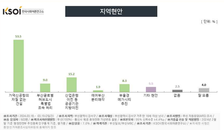 가덕신공항 53.5, 산업은행이전 등 공공기관 지방이전 15.2, 부산글로벌 허브도시 특별법 9, 부울경 메가시티 8.3, 에어부산 분리매각 1.9