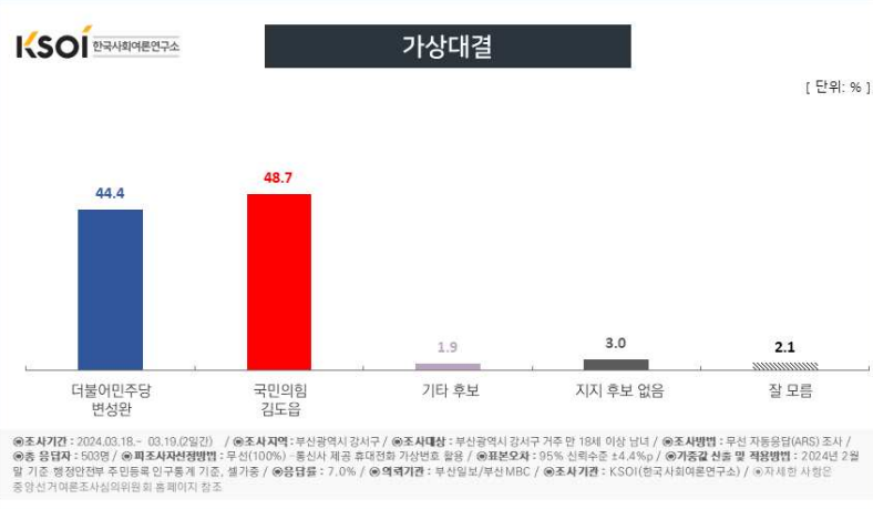 지역구 후보. 민주당 변성완 44.4, 국민의힘 김도읍 48.7