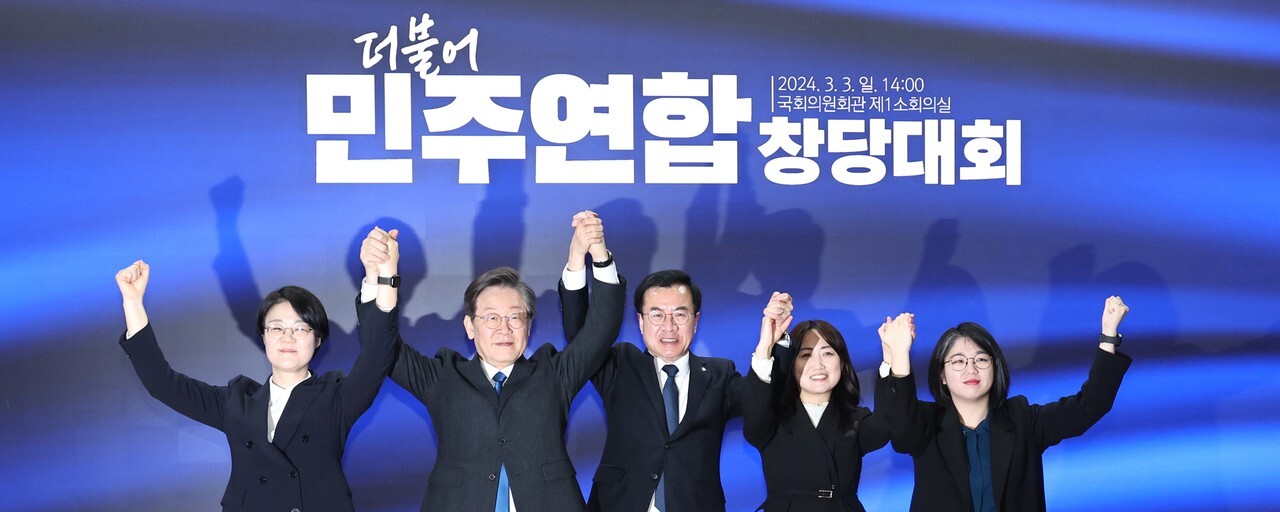 더불어민주당 이재명 대표를 비롯한 참석자들이 2024년 3월3일 서울 여의도 국회 의원회관에서 열린 더불어민주연합 중앙당 창당대회에서 기념사진을 찍고 있다. 왼쪽부터 진보당 윤희숙 대표, 이재명 대표, 더불어민주연합 윤영덕·백승아 공동대표, 새진보연합 용혜인 상임대표. 연합뉴스