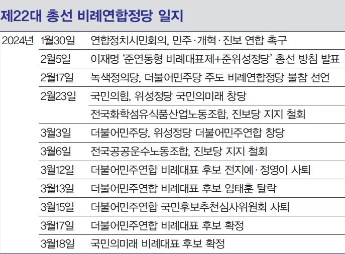두 차례나 위성정당을 낳은 준연동형 비례대표제 등 선거제도를 다시 살펴야 한다는 지적도 나온다. 신진욱 중앙대 교수(사회학)는 “더불어민주연합과 국민의미래 비례대표 공천에서 보듯 민주적 절차를 위배하고 불투명하게 후보를 정한다면 국민 입장에선 지역구에서 직접 후보를 뽑는 것만 못할 수 있어 비례대표제 강화의 필요성을 느끼기 어려울 것”이라며 “비례대표제를 강화하되 각 정당이 민주적으로 비례대표 후보를 선출하도록 제도 개선이 이뤄져야 한다”고 강조했다.