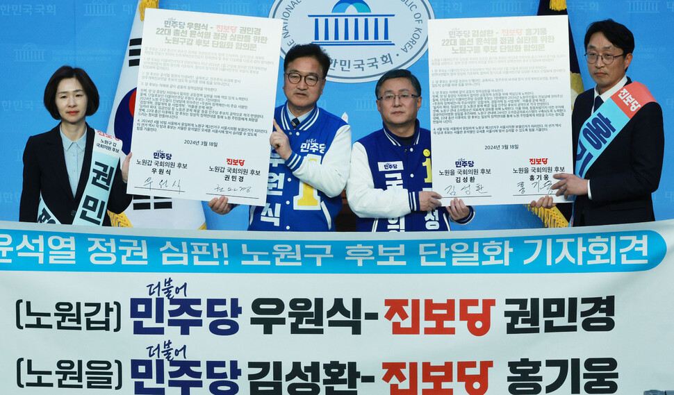 제22대 국회의원 선거에 출마한 더불어민주당 우원식 후보(서울 노원갑)와 김성환 후보(노원을), 진보당 권민경 후보(노원갑)와 홍기웅 후보(노원을)가 2024년 3월18일 오후 국회 소통관에서 단일화 합의 기자회견을 하고 있다. 연합뉴스