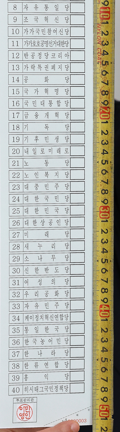 비례대표 후보 등록을 신청한 정당 38곳 모두 선거 참여가 확정되면서 투표용지는 역대 최장인 51.7㎝에 달한다.