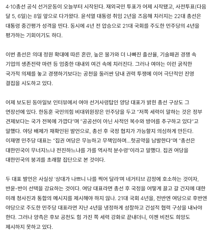 다른 나라 좋은 점은 배워서 우리 것으로 만들자. 연합 정치를 하려면, 민주당이나 국힘은 총선 후에 해야 한다. 2개 정당이 아닌 다른 정당들이 의석을 배출할 수 있도록 해야지, 민주당이 '맏형' 노릇을 할 필요도 없다.
