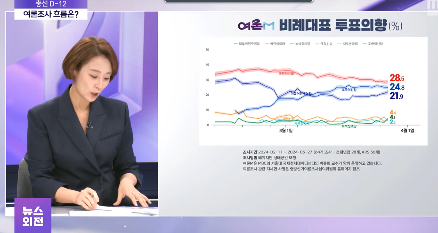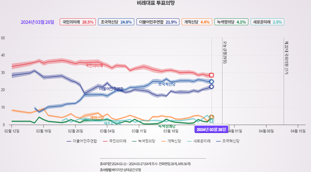 국힘위성 28.5, 조국혁신당 24.8%, 민주위성 21.9%, 개혁신당 4.4%, 녹색정의당 4.1%, 새로운미래 2.5%
