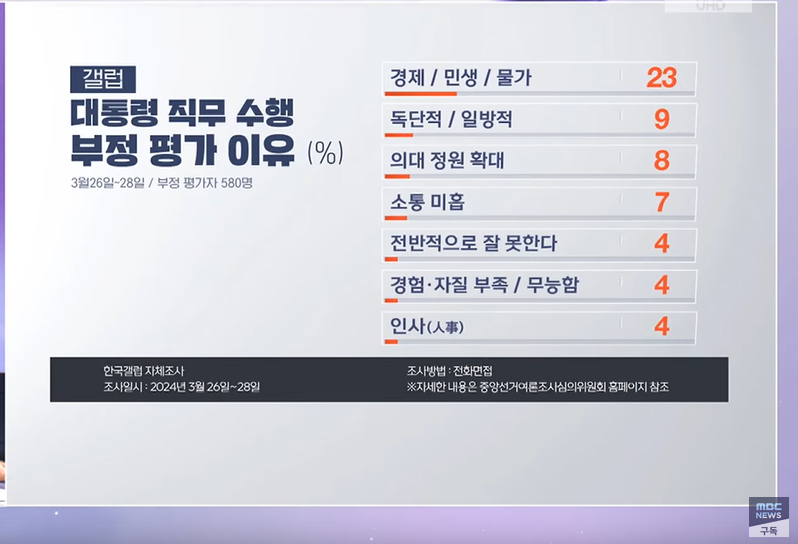 경제 민생 물가 23%, 독단적 일방적 9%, 의대정원확대 8%, 소통 미흡 7%, 전반적으로 못해 4%, 경험 자질 부족 무능 4%, 인사실패 4%