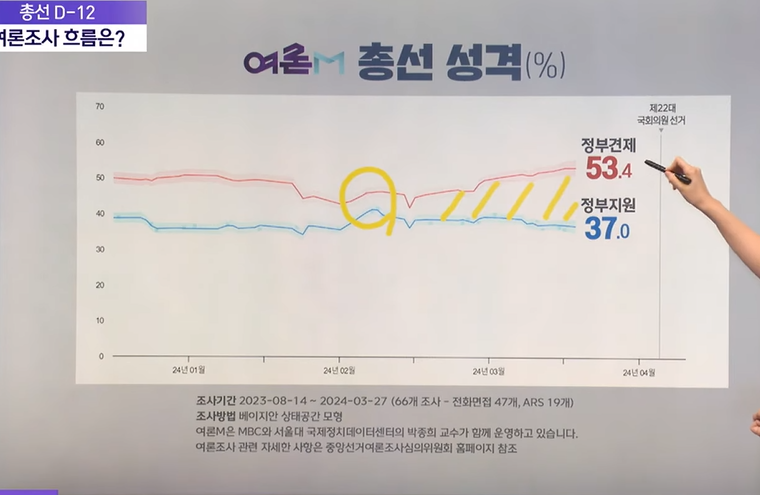 총선 성격. 정부 견제 53.4, 정부 지원 37.