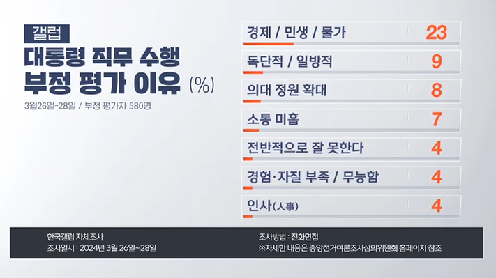윤석열 정권이 인기가 없는 이유들 중에 압도적인 1위가 경제 민생 물가 (25%)에 대한 무능이다.