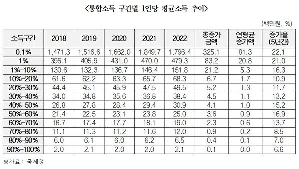 2022년 상위 1%의 평균소득은 4억7930만 원으로 2018년부터 매해 2080만 원 꼴로 늘었고, 상위 10%의 연평균 소득은 1억5180만 원으로 매년 530만 원 꼴로 늘었다.