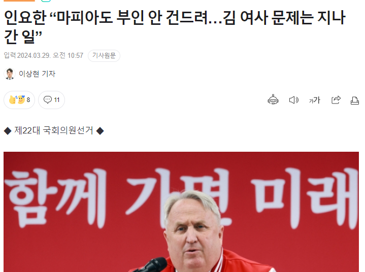 국민의힘 인요한이 이준석의 영어 연설을 듣고 정신적 충격을 세게 받은 모양이다. "내가 뉴욕 4년 살아봤는데...마피아도 아이와 부인은 건드리지 않는다"
