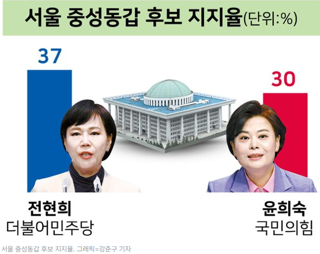 서울 중성동갑 여론조사 판세는 백중세다. 한국일보-한국리서치 여론조사에서 전현희 더불어민주당 후보 37%, 윤희숙 국민의힘 후보 30%로 오차범위 내 접전이었다. 민주당이 임종석 전 대통령 비서실장 공천 배제로 홍역을 치른 곳이지만 표심에 결정적 영향을 미치지는 않은 것으로 나타났다.