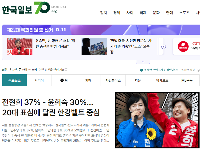 서울중성동갑. 민주당 전현희 37, 국힘 윤희숙 30. (한국일보-한국리서치)