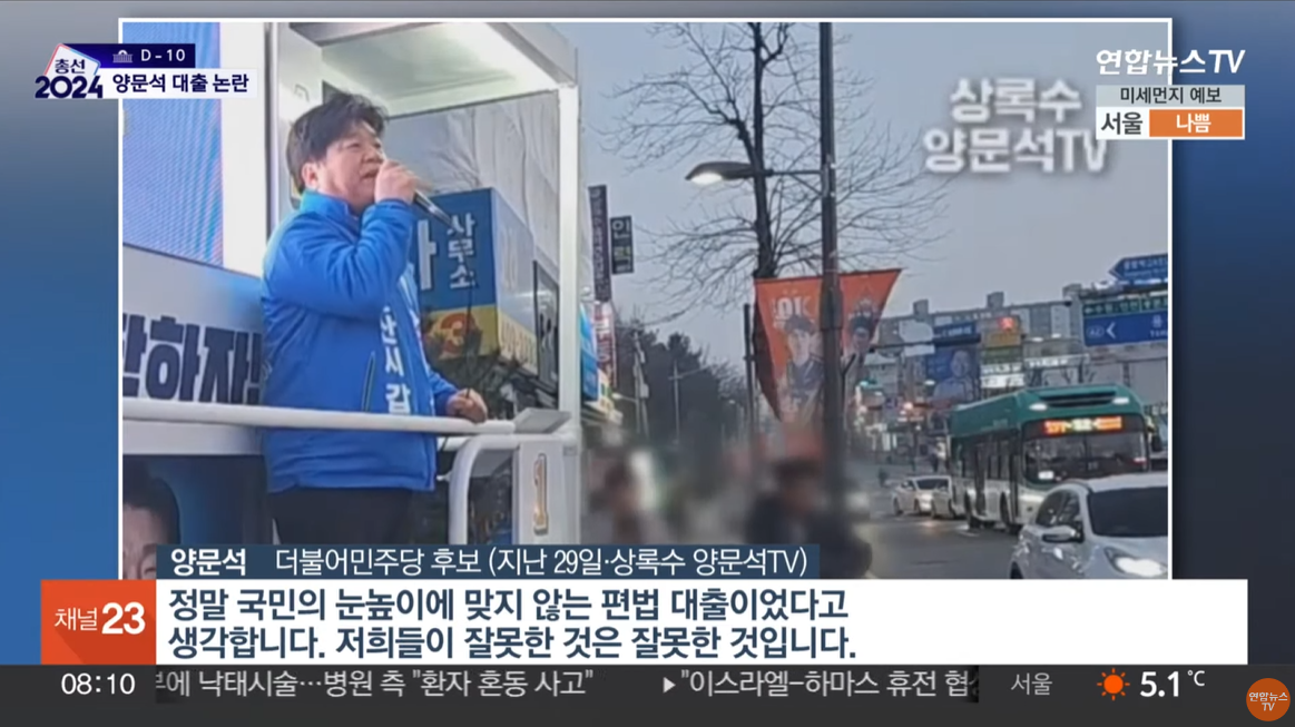 서울 서초구 잠원동 31억 원짜리 재건축 아파트를 사면서 대학생 딸 명의로 11억 원의 사업자 대출을 받아 논란이 된 양문석 더불어민주당 안산갑 후보가 “사기 대출로 몰아가는 것에 대해 침묵할 수 없다”고 항변하고 나섰다. 양 후보는 “편법 대출은 비판받아 마땅하다”고 사과하면서도 “우리 가족의 대출로 사기당한 피해자가 있나”라고 반성하지 않았다. 업계 관행인 만큼 자신을 파렴치범으로 몰아선 안 된다는 어이없는 주장이다.