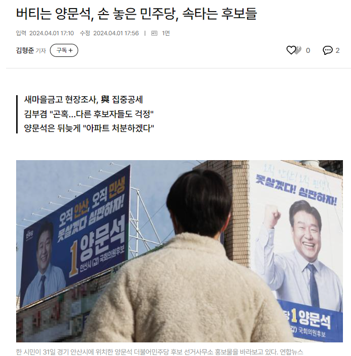 더 황당한 건 그다지 큰 문제로 보지 않는 민주당의 반응이다. 본인이 깊이 사죄하면 될 일이지 사퇴할 사안은 아니라는 분위기다. 공천 심사 중 이를 걸러내지 못한 책임부터 통감하고 사과해야 할 민주당은 열흘만 버티면 된다는 생각인 듯한데, 그의 부동산 투기는 민심의 역린을 건드린 문제다. 양 후보는 노무현 전 대통령도 '실패한 불량품'으로 폄하한 바 있다.